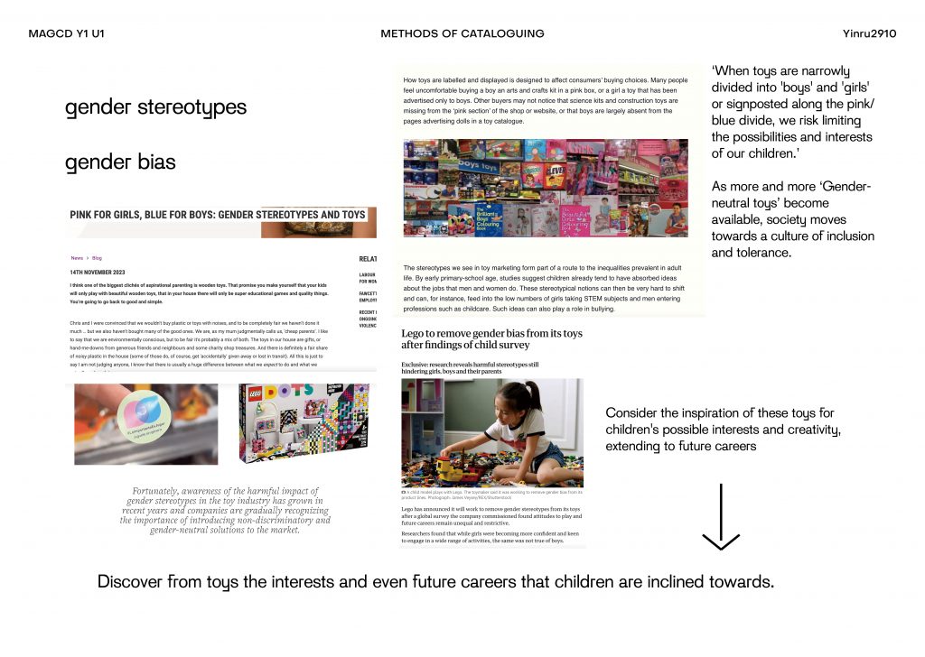 Based on some feedback from the previous tutorial, I ended up choosing the topic of ‘gender biased toys for children’ to develop. I think the focus can be on the interests that children may develop from using the toys rather than what colour or type of toys children should select.